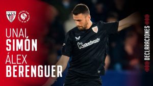 Los jugadores del Athletic Club Unai Simón y Álex Berenguer comparecen en el Ciutat de València tras...